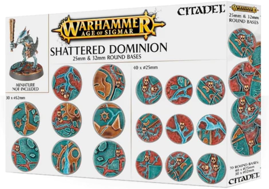 Introducing the Shattered Dominion 25mm & 32mm Round Bases, brought to you by Games Workshop. These bases are a perfect match for the incredible Realm of Battle: Shattered Dominion gameboard, and they’re here to take your Warhammer Age of Sigmar collection to the next level.